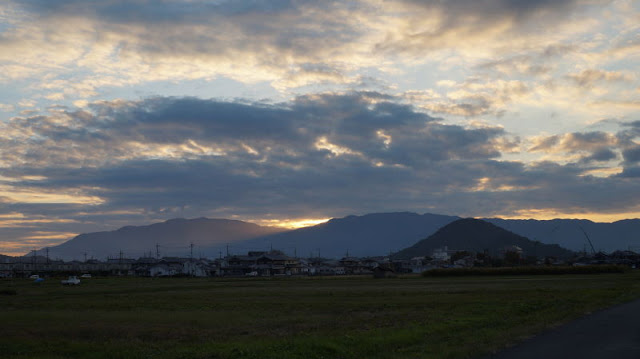 途中、畝傍山の向こうに日が落ちて雲行きが綺麗でした。枯れたコスモス畑の中で妻君と、暫し佇んで見入ってしまった。